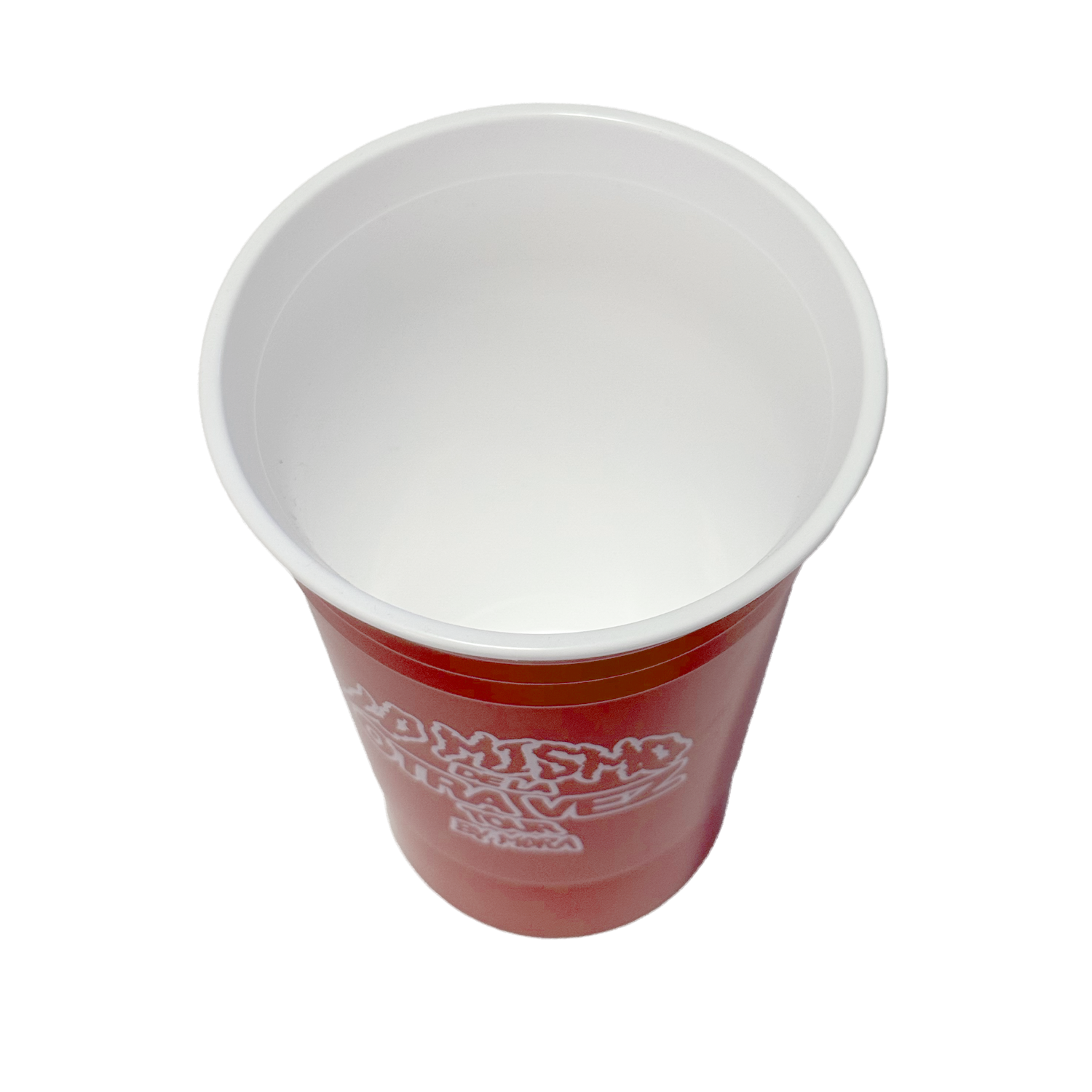 Red Cup and white on the inside with the tour (LMDLOV) logo printed on it. 16 Oz. Double Wall Tri-Edge Plastic-Premium UV.